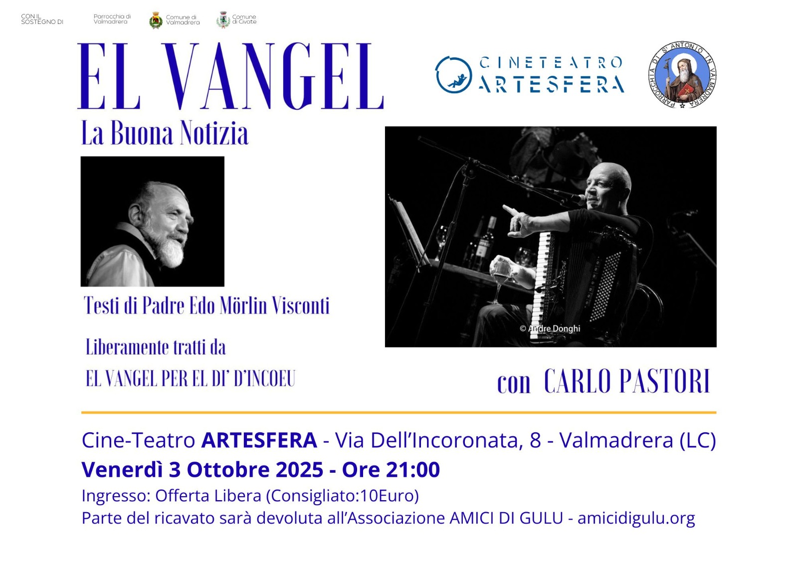 Venerdì 3 ottobre 2025 alle ore 21:00, presso il Cine-Teatro Artesfera di Valmadrera (LC), in Via dell’Incoronata 8, andrà in scena lo spettacolo “El Vangel – La Buona Notizia”, con Carlo Pastori.