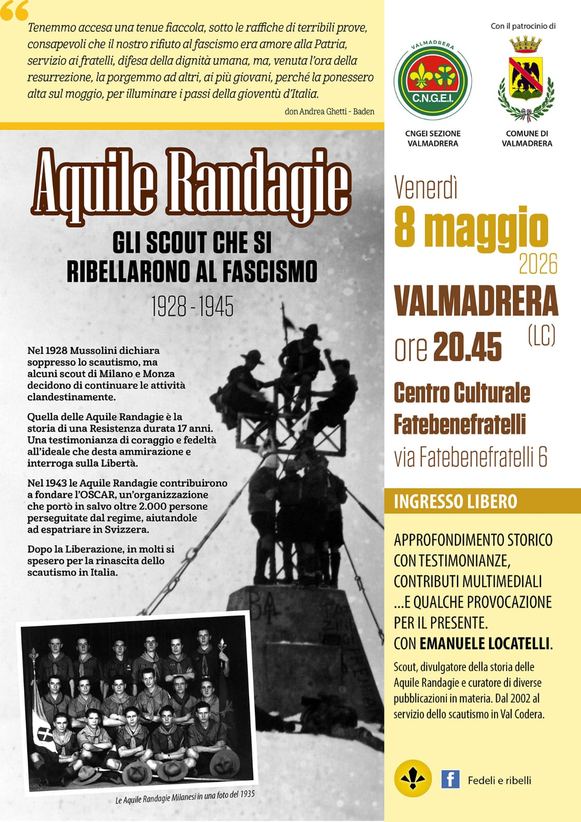 Venerdì 8 maggio appuntamento alle 20:45 presso il Centro Culturale Fatebenefratelli con "Aquile randagie: gli Scout che si ribellarono al fascismo (1928-1945)".